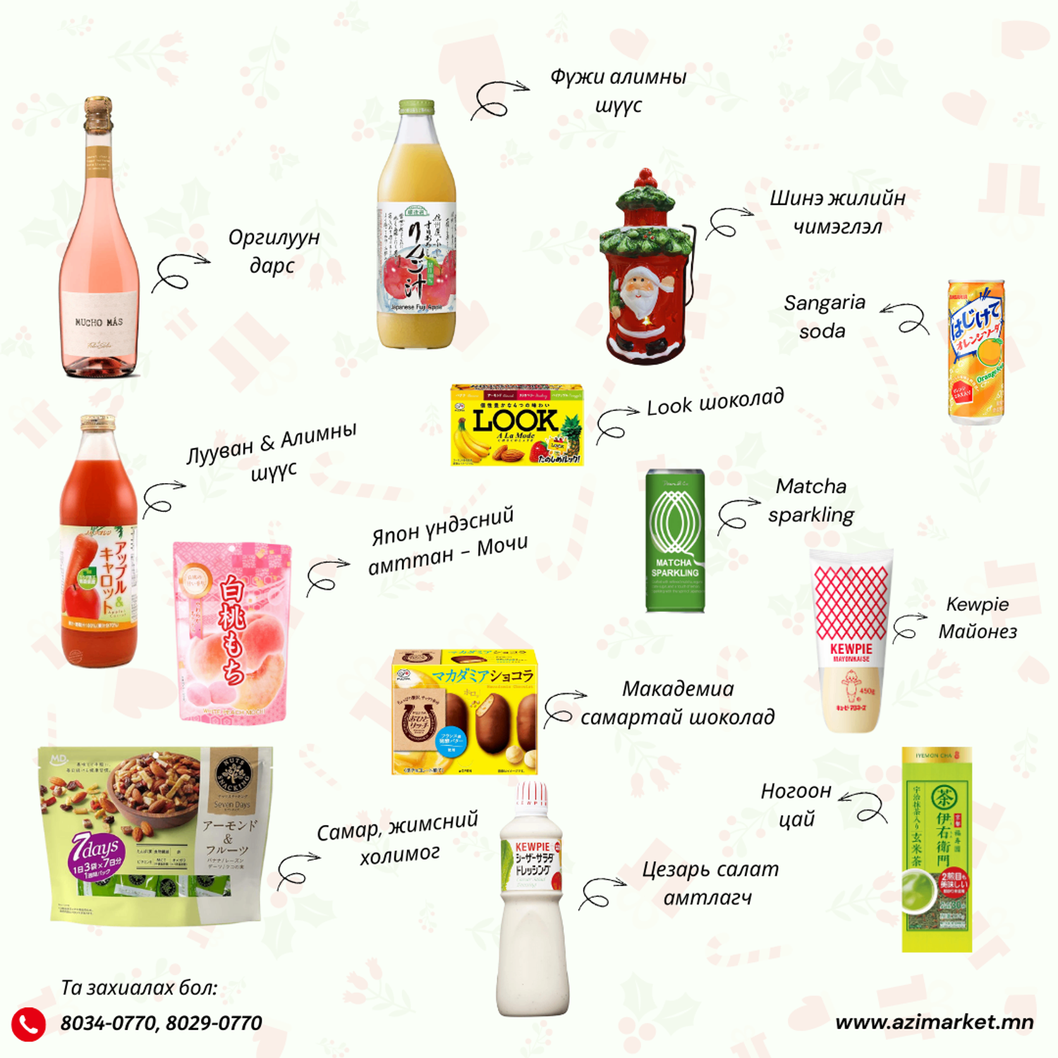 Баярын уур амьсгалыг бүрдүүлэх гоёмсог сагс, бэлгийн боодолтой энэхүү багцад шинэ жилийн баярын ширээний төгс бүрдэл багтсан. Гэр бүл, дотны найз нөхөд, хамт олондоо халуун дулаан сэтгэлээ илэрхийлэхэд хамгийн тохиромжтой сонголт юм.